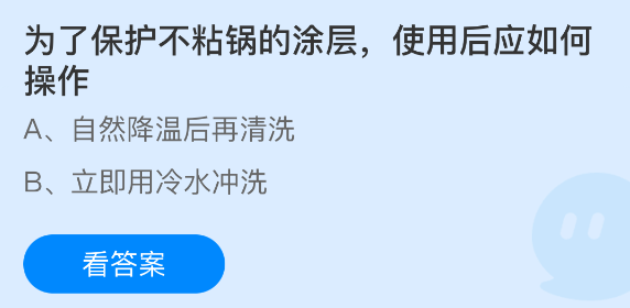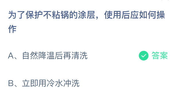 为了保护不粘锅的涂层,使用后应如何操作?支付宝小鸡课堂开课啦!每天花一分钟答题赚饲料,喂喂小鸡就能贡献爱心啦!轻松又意义十足!2026年1月27日蚂蚁庄园的小鸡课堂题目正确答案是【自然降温后再清洗】,为了保护不粘锅的涂层,使用后应自然降温后再清洗。