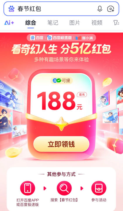 2026年百度APP春节红包活动已开始。用户可搜索“春节红包”参与:体验“奇幻人生”AI互动并集卡,前1000名集齐5张稀有卡可赢最高万元现金;每晚20点还可通过文心助手猜口令抢隐藏红包,最高得1088元。活动持续至2月24日。
