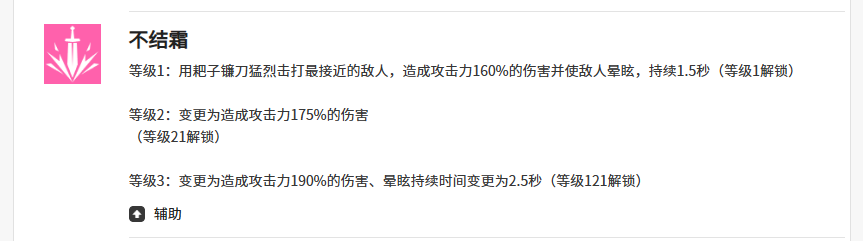 另外克拉拉在技能二效果上面可以带来不结霜的能力,此时是可以带来攻击能力的招式,利用这个不结霜,克拉拉可以利用自己的镰刀作为武器,快速的攻击目前离她最近的一个敌人,接近这个敌人进行输出的时候,造成的攻击能力会有160%的伤害数值,其中带有的控制是眩晕的能力,持续时间只有1.5秒的时候,大家就要注意后期快速的其他的技能使用才会更好,最强的时候是不结霜的技能强度达到等级3,那么此时眩晕的时间会更长一些,可以达到2.5秒。