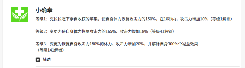 而小确幸这个技能其实针对克拉拉来说就是给自己带来足够的治疗恢复,这里她通过小学新技能会产生一个苹果,通过食用这个苹果,克拉拉可以给自身带来足够的攻击,体力恢复基本是根据克拉拉的攻击数值提取150%的数值来进行恢复。而且此时克拉拉不仅可以让自己的生存血量变得更多,还可以在后续的10秒时间之内通过16%的攻击加成来快速给敌人带来更多的伤害能力,达到等级3的时候,此时还可以解除自身的减益效果,这里解除的简易效果上面达到的百分比也有300%的数值。