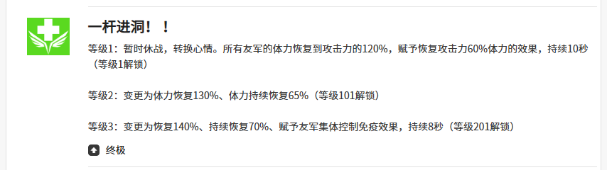 如果想要暂时休战的话,大家其实可以用的是克拉拉的一杆进洞技能,这个技能使用的时候,可以将所有友军的体力恢复到根据攻击力提升到120%的数值上面,这样有足够体力的时候还可以带来的一个效果会更强势一些,另外她后期带来的持续时间也有10秒时间,大家可以完全作为先手使用的状态来进行使用,后期接其他的输出技能是最好的。