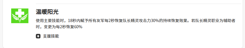 最后就是克拉拉在使用自己支援技能的时候,会有一个温暖阳光的被动,也就是团队的增益技能可以触发,触发这个技能的时候,她持续的被动效果有18秒时间,在此时可以赋予所有的队友恢复队长效果身上30%的持续治疗,当然如果是克拉拉作为队长的话,那么这里是可以为同为辅助者的角色,带来每2秒60%的一个恢复,所以在此时克拉拉带来的全队生存机制是非常高的。
