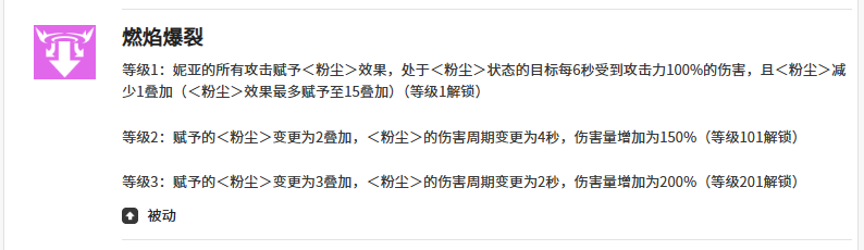 另外她的第四个技能是燃焰爆裂,这个技能对于你来说其实就是打基础带来各种状态加成的一个技能,前期收到的粉尘状态基本也是靠这个技能来施加的,只要是处于粉尘状态当中的敌人,那么在其中每秒都会受到妮亚在攻击力上面100%的伤害,且这里粉尘的层数叠加。当中如果减少一层的话,后期大家也可以快速低叠加起来,一般在叠加层数上面,一个角色最多是可以叠到4-5层的粉尘能力的,所以大家如果要玩好妮亚自身的各种技能距离粉尘的状态,一定要学会施加这个状态哦。