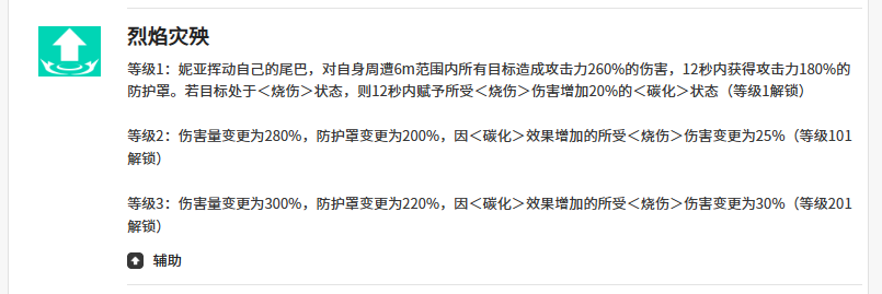 而第二个技能效果叫做烈焰灾殃,这个技能对于妮亚来说一般使用的情况下会比其他的两个技能范围要小一些,这里只能根据她周边6m范围当中的敌人来进行输出,这里输出的时候造成的伤害只有260%的伤害,但是在后续的12秒时间之内,她都可以获取180%的防御护盾能力,这里的防护罩如果给她带来防护的话,其实坚持的时间还是比较久的,而且在他给敌人输出的时候选中的这个目标,如果身上有烧伤状态影响的话,那么妮亚在这里还有12秒的时间可以继续给对面施加足够的烧伤,在伤害效果上面会增加20%的碳化状态,这样进行输出的话,敌人受到的持续伤害能力也会更多一些。