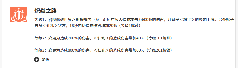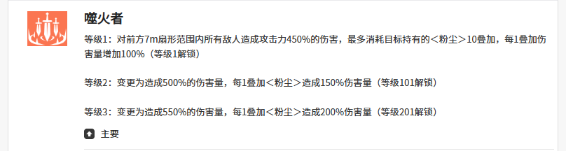 其实妮亚一般情况下第一个会使用的技能叫做噬火者,这个技能可以让她带来一个扇形范围的输出,而且是根据她目前站位找到前面7m左右的范围区域,对其中的敌人造成40%的伤害之后,她可以消耗掉身上持有的粉尘效果,一般情况下这里如果达到四层的话,每一层噬火者为她带来的伤害量提升都达到了100%的数值,后期如果想要升级的话,技能升级对于她攻击力带来改变,是体现在550%的伤害量提升效果上面。
