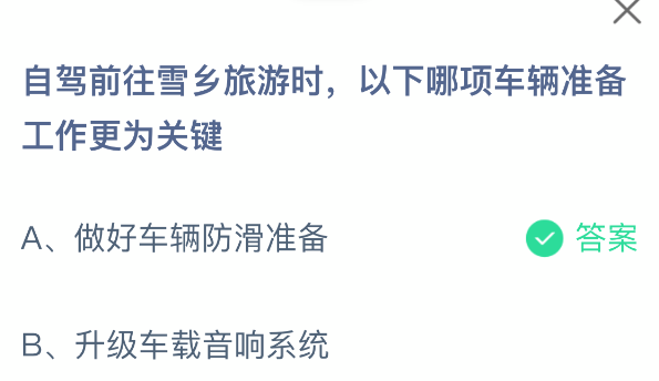 以上就是自驾前往雪乡旅游时,以下哪项车辆准备工作更为关键?支付宝蚂蚁庄园2026年1月30日答案最新,更多相关攻略,请关注3dm手游网更新!