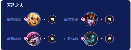 1、前期做羊刀过度强度最高,建议用龙魂小炮天选,搭配2格斗3龙魂2射手羁绊打工。连败局可以不拿天选,等5人口拿2-3费天选。