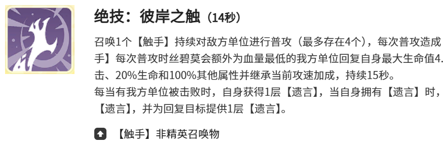 绝技【彼岸之触】是丝碧莫持续作战体系的核心枢纽:14秒冷却,召唤持续15秒的触手,继承本体80%攻击力、100%其他属性及20%最大生命值;期间每次攻击造成50%魔法伤害,并自动为我方生命比例最低的单位恢复其最大生命值的4.1%。当有队友阵亡时触发【遗言陈述】机制,触手后续攻击所附带的治疗效果可定向转移至指定受疗目标,大幅提升关键单位保命效率。被动技能【暗影滋养】提供成长型增益:每当阵容中存在召唤物阵亡,丝碧莫永久获得4%攻击速度与2%最大生命值提升,越战越强特性在长线拉锯战中尤为突出。