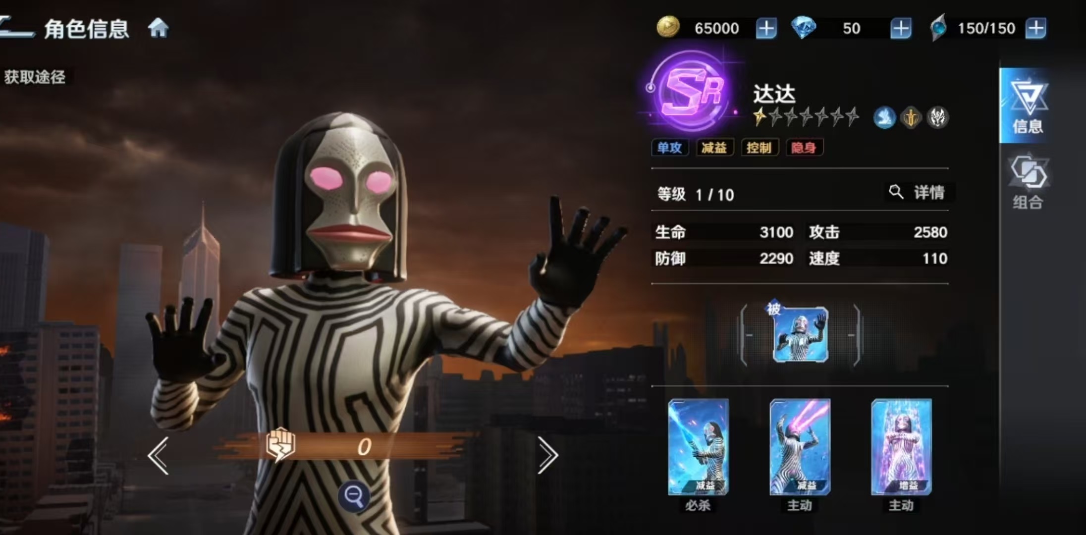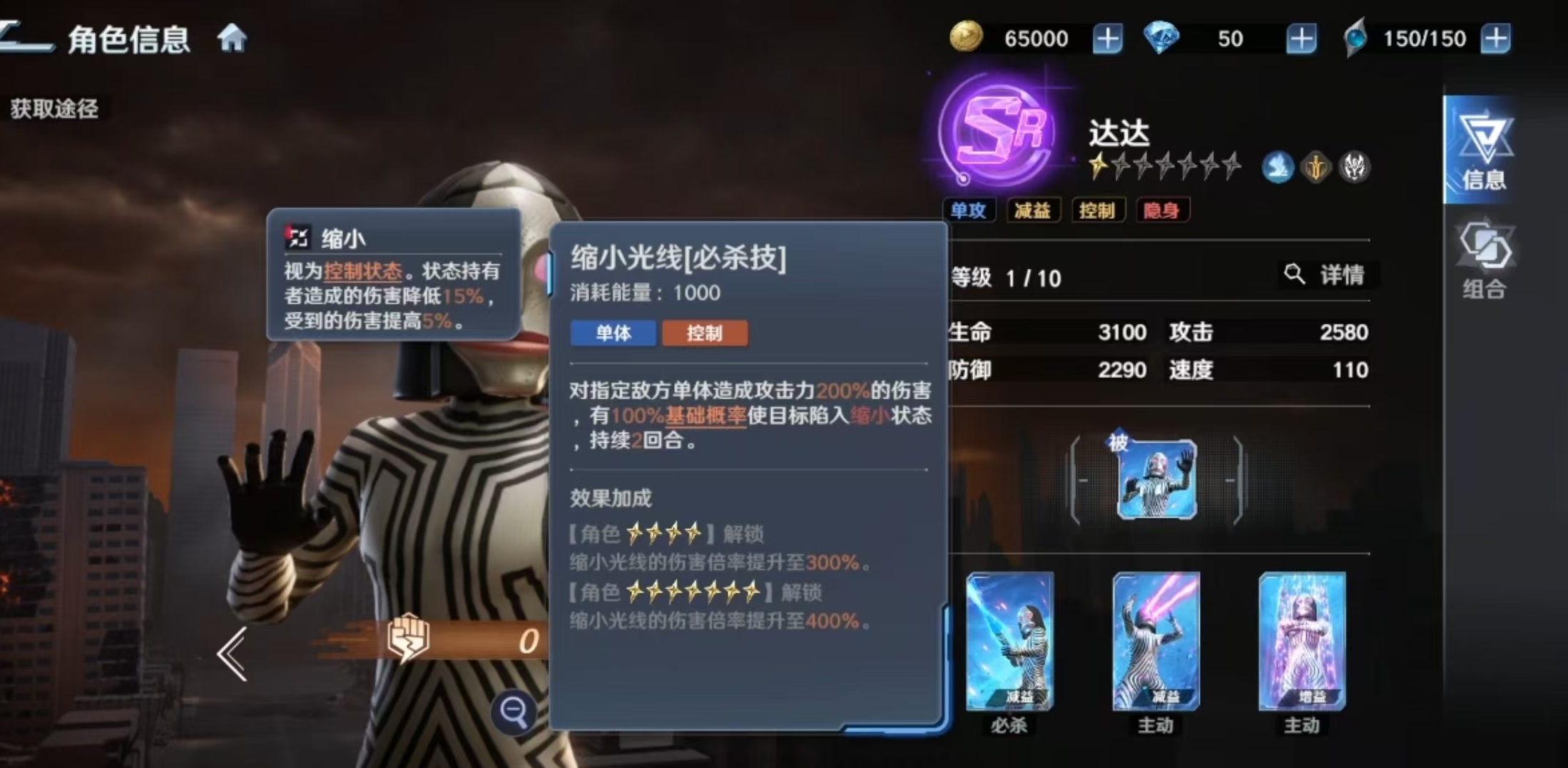 达达的核心输出技能为必杀技“缩小光线”,可对敌方单体造成伤害,并有概率施加持续两回合的“缩小”状态。该状态属于硬控类效果,能显著压制对方主力输出单位的行动能力,在单核阵容对抗场景中尤为关键。随着技能等级提升,基础伤害倍率同步增强。另一主动技能“眼部光线”则提供单体伤害与眩晕控制,星级提升后伤害与触发概率均有所提高,但受限于SR品质,整体眩晕稳定性仍处于中等水平。此外,“隐身”为其核心生存技:发动后进入不可选中状态,同时获得“瞄准”效果;若场上存在其他可攻击目标,则自身不会成为敌方技能或普攻对象,大幅延长站场时间。