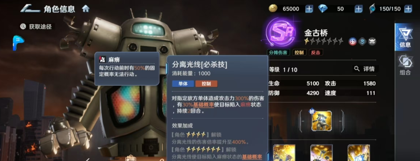 金古桥作为SR级角色的核心优势就是升星门槛很低,玩家只需通过基础卡池或者开服福利活动就可以轻松获得,重复产出可以迅速推动其向高星级演进,甚至在前期就表现出超过低星SSR的统治力。将获取难度和成长曲线融合在一起的现状,使游戏的战术养成上限被大大地提高了,每一次对格挡属性、减伤权重的配置都具有很高的策略性价比。