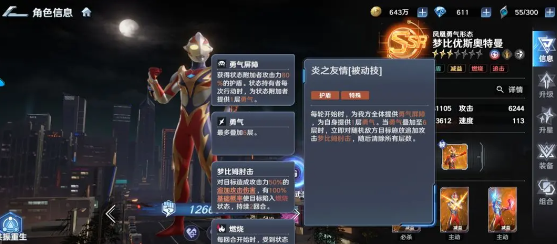 奥特曼光之战士凤凰勇者角色的核心技能机制来源于一套把灼烧状态和全队增益完美融合起来的战斗体系。实战中凤凰勇者的定位实现了血量、防御和攻击三者的完美平衡,是战场上的多面手。必杀技梦比姆骑士射线不仅会对单体目标造成巨大伤害,在角色达到七星以后还会发生质变,使目标进入凤凰标记状态。这种将个人输出与全队暴伤提升深度绑定,使该角色在面对高难度BOSS的时候具有极高的战术权重,从而可以通过标记系统实现伤害的爆发式飞跃。