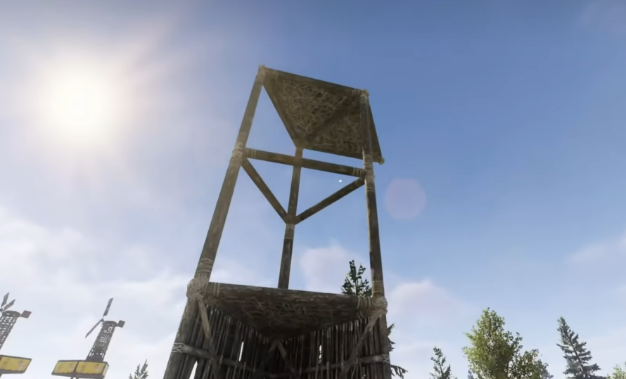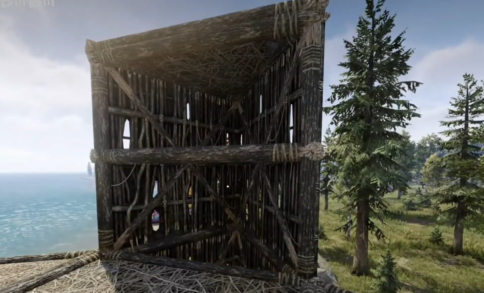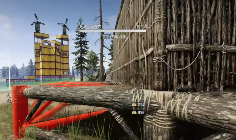 下一步是扩建炼油机房间和复活房。先把地基建好,然后把左边那块方形地基拆掉,因为炼油机只能放在地面上。装一个门框用来放售货机,再把周围围起来。记得在中间位置留个门。这边可以放床和衣柜,另一边就是炼油机和售货机的位置。回到二楼,可以扩建一个小炮眼,这个对前期守家帮助挺大的。把二层的墙围起来,再建上去的路,顺便把顶部盖好。到这里其实也可以停一停,要是这时候能搞到卷帘门,晚上睡觉就安全多了。