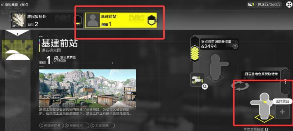 拿到蓝图以后,接下来的步骤就比较顺了。回到基建前站,使用刚才获得的低容谷地电池蓝图,选择批量制作功能,把电池生产出来。制作完成后直接在基建前站进行交易,交易成功就能获得据点发展值,积累到足够的数值后,基建前站就能顺利升到2级,任务也就完成了。