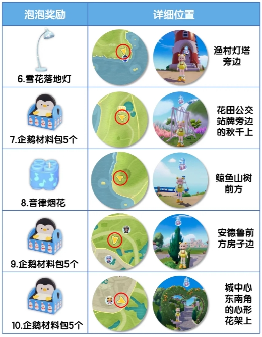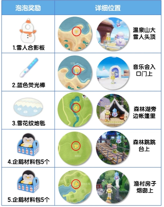 冰雪潮流季的10个限定隐藏泡泡为一次性收集道具,可获取专属家具与材料。它们分布在:温泉山(滑冰场雪人上空、音乐会入口上空)、森林(小鹿塔下帐篷、跳跳台凯西附近)、渔村(东栈房顶烟囱、灯塔门顶)、草原(湖边秋千上空)、鲸鱼山瞭望台上空、安德鲁边房子上空及花园街入口爱心拱门上空。触碰即可领取。