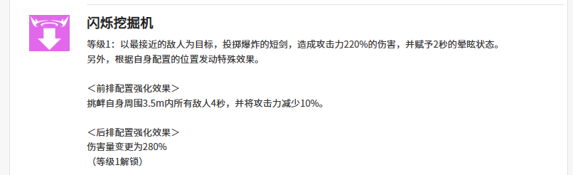 而米里昂的辅助技能可以使用的是闪烁挖掘机,这个技能目前根据最靠近她的敌人来输出,可以投掷出来爆炸的技能效果,造成200%的攻击之后,还可以同样给敌人带来2秒的眩晕,虽然时间持续的比较短,但是目前根据米里昂自身的定位同样是有特殊能力可以进行触发,此时的她站前排,那么会根据自身站位百分比带来攻击力减少10%的能力,但是此时周围3.5m之内所有的敌人都会受到她的这个影响,如果米里昂要是站在后排的话,那么这里达到了伤害量提升,就会强化到280%的数值。