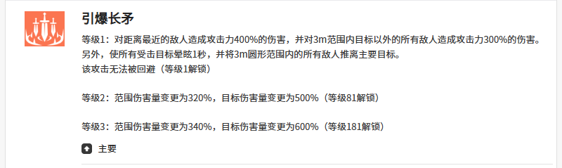 这里利用米里昂的主要技能可以带来引爆长矛的能力,此时进行攻击会对距离米里昂比较近的敌人造成400%的攻击,这个数值还是不错的,另外还可以对3m范围之内除了主要输出目标以外所有的敌人,再一次造成攻击力300%的伤害,虽然这一次的伤害不是达到了很高的数值,但是毕竟第二次输出的连招里面,是一个群伤效果,而受到所有伤害的敌人身上都会达到1秒的眩晕,并且在此时将3m范围内的敌人都推离他攻击的主要目标,这个攻击没有被对面回避的时候,其实大家就可以快速的将敌方的输出角色孤立出来,这样的话选中一个主要目标进行输出,后期就可以很快的带来集火的能力。