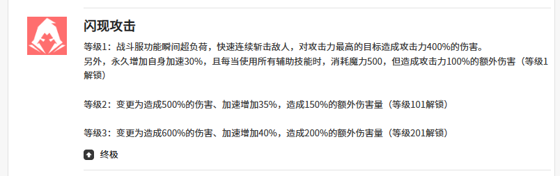 米里昂终极的大招效果上面可以带来的是闪现反击,此时攻击敌人带来的连续斩击能力当中会造成400%的攻击,而且目前这个攻击能力是针对敌方输出最高的敌人进行的,而且此时给自己带来的数量加成,是在当前关卡当中永久增加30%数值的,所以后期米里昂只要使用辅助技能的话,就会消耗掉500魔力,但是此时造成的攻击力、生命额外伤害会达到100%的数值。最后的支援技能带来的是超频加速,米里昂使用这个技能是只能针对后排的友军带来足够的增益能力,此时的增益体现在伤害跟速度加成效果上面都是带来25%的提升时,米里昂可以给队友带来的各方面能力还是有比较强势的数值可以看到的。