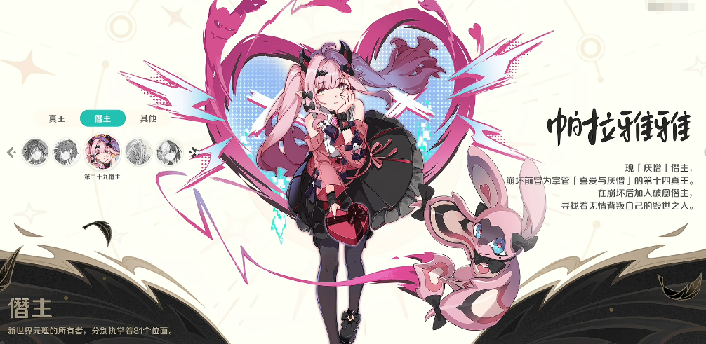 那么在这里因为本期围绕的核心角色就是帕拉雅雅,她作为前期非常重要的一个真王,其实在现在的身份上面是第29届僭主,她的身份在转变的剧情当中其实也体现了各个角度的人设相关设定,在当前作为真王的话,掌管的是喜爱以及厌恶,作为此类情感原型当中的真王之一,她对于情感来说是非常敏感的,所以通过这样的剧情发展到后期跌落到第29僭主的话,是因为帕拉雅雅的各种行为方式进行了改变,利用她的这个背景,其实很多玩家会喜欢用她的形象,这里的帕拉雅雅只有后期通过厌恶类型的能力可以带来一部分的驱动能力效果,当前的帕拉雅雅作为一个有足够机动性的角色,其实在战斗效果当中大家要注意她适合走的是控制流效果,因为当前的帕拉雅雅在外观上看起来非常像一个走洛丽塔风格的公主,但是自身的各项数值当中,灵活性是可以为她带来足够优势的。