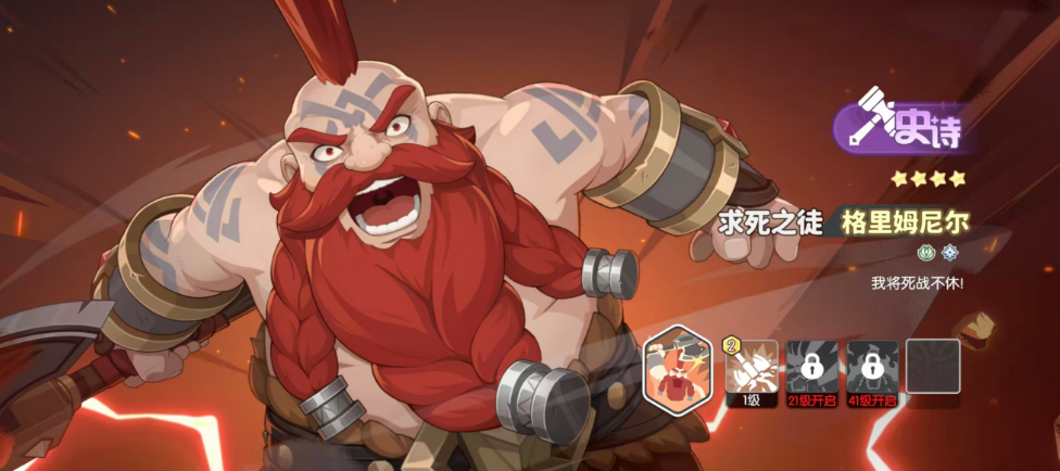 第三个为大家推荐的史诗角色叫做格里姆尼尔,格里姆尼尔在当前的使用效果当中可以造成的攻击效果最好是连续攻击同一目标,那么这样的情况下,就可以快速对这个目标造成伤害的时候带来19%攻速的提升,而且在最多的时候是可以叠加到10层,所以这个无所畏惧的天赋给他带来的叠加层数是非常高的,总结起来的话是有190%的整体攻速加成,后期在变更另外一个目标进行输出的话会直接清零,所以在前期建议大家找一个最重要的输出角色,作为他输出的固定目标,后期再处于狂野状态的时候,那么这里格里姆尼尔就可以带来自身奥义消耗量生命减少一点的节能效果,放在这里使用的话,他其实在高空当中有更多输出优势,可以快速的发动重劈对敌人进行270%的物理伤害。