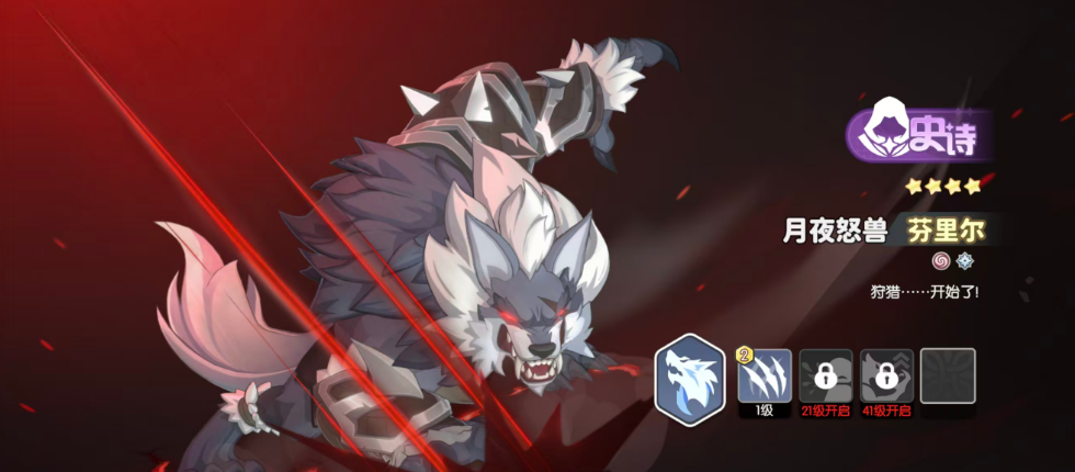 第二个为大家推荐的史诗级角色就是芬里尔,芬里尔当前使用的技能效果当中可以带来的恢复能力是非常具有天赋强度的,这个技能可以让他在场上存在一些血量低于一半的地方目标时,可以根据他这里的生命数值来进行32%的生命转化,另外如果触发了这里状态效果的话,那么此时就要成功击败这个目标,芬里尔就可以快速重置自己的技能冷却时间,每次在我放角色释放大招之后,芬里尔他身上就可以获取一层唤醒的状态加层,一层唤醒状态获取小号的话是可以额外提升分离,而身上4%的生命转化能力,所以放在这里可以通过各种技能来进行转化的话,芬里尔的技能效果也是非常突出的,后期还可以利用追猎时刻技能来造成打断对面输出伤害的方式,造成更多的团队配合效果。