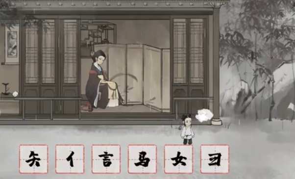 《栖云异梦:梦蝶》第二十关“时间”描绘了生命成长的过程。首先对孕妇使用【孕】拆出的【子】,使孩子辽沐出生。用【妈】拆解合成【奶】喂养婴儿。以【水】唤雨,再与【妇】拆出的部件合成【雪】降下。孩子生病时,用【妪】与【矢】合成【医】进行治疗。最后,将【信】与年迈母亲【她】拆解合成【他】,赋予长大的辽沐,完成生命循环的演绎。