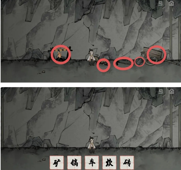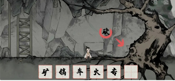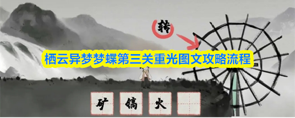 栖云异梦梦蝶游戏中,第三关“重光”为核心汉字解谜。首先在场景中收集“炊”、“矿”、“镐”、“砖”、“车”等字。将“炊”与“砖”拆解并重组为“砍”字,用于清除挡路大树。随后,组合出“转”字并将其置于水车上,修复机关后即可渡河过关,推进剧情。