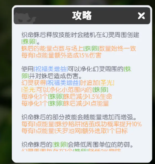 织命蛛后为命运织命阵营核心BOSS,机制核心在于“未及时清除蛛卵即导致战局崩溃”。蛛卵不仅提升蛛后自身伤害,还会施加减防、禁疗等强控效果,随层数叠加逐步压制我方生存空间。清除蛛卵的唯一手段是依赖祝福类增益效果。因此,阵容须优先构建士气类Buff体系:英雄导师与烈焰魔女均可稳定附加士气增益;远古魔像的斗志效果可同步提升全队续航强度;进阶选择智慧女神,可进一步强化斗志的承伤转化效率,显著提升容错率与持久作战能力。