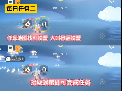 拾起一只螃蟹:在螃蟹周围长按自己的光之子即可掀翻螃蟹然后点击手掌图标将其捡起即可。