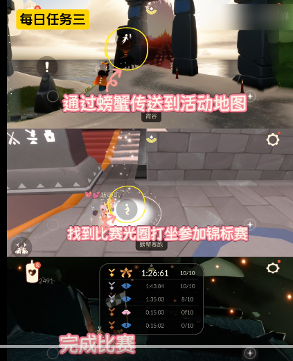 参加锦标赛:前往霞谷竞技场(遇境霞谷旁/云巢活动告示板的奖杯螃蟹可以直达),打坐参与锦标赛。