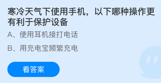 寒冷天气下使用手机,以下哪种操作更有利于保护设备?支付宝小鸡课堂开课啦!每天花一分钟答题赚饲料,喂喂小鸡就能贡献爱心啦!轻松又意义十足!2026年2月5日蚂蚁庄园的小鸡课堂题目正确答案是【使用耳机接打电话】,寒冷天气下使用手机,使用耳机接打电话更有利于保护设备。