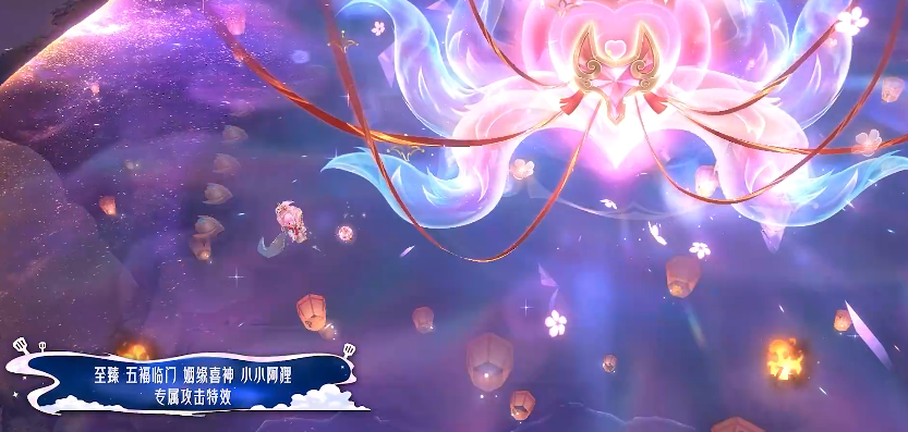 1、攻击特效:蓄力 1.5 秒后发射一颗巨大的粉色爱心,爱心周围环绕金色桃花瓣,击中小河灵后会出现金色水晶特效,随后爆炸分散开,同时有喜鹊飞过的特效。