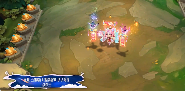 2、淘汰特效:战斗胜利后,阿狸会发射 Q 技能命中对手小小英雄,同时周围绽放大型烟花,出现 "五福临门" 和 "姻缘喜神" 的金色文字,少司狸精灵会在空中组成 "囍" 字。
