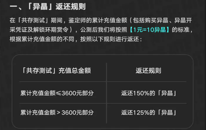 先说充值异晶的返还。测试期间充钱买异晶,公测后会按1块钱等于10个异晶来算。充值金额在3600块以内的部分,返还150%的异晶。超过3600块的那部分,返还125%的异晶。假如你充了5000块,那前3600块能拿回54000异晶,剩下1400块能拿回17500异晶,加起来就是71500异晶。这个返还比例算是相当不错了。