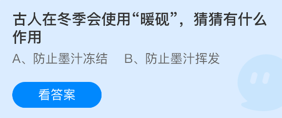 古人在冬季会使用“暖砚”,猜猜有什么作用?支付宝小鸡课堂开课啦!每天花一分钟答题赚饲料,喂喂小鸡就能贡献爱心啦!轻松又意义十足!2026年2月9日蚂蚁庄园的小鸡课堂题目正确答案是【防止墨汁冻结】,在寒冷的天气里,墨汁容易在砚台中结冰,导致书写困难。暖砚通过加热砚台,保持墨汁的流动性,以便文人能连续书写。