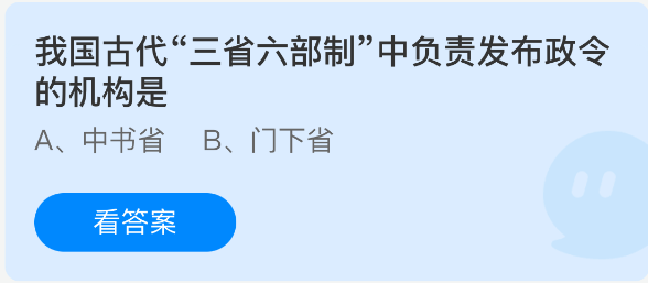 以上就是我国古代“三省六部制”中负责发布政令的机构是?支付宝蚂蚁庄园2026年2月11日答案最新,更多相关攻略,请关注3dm手游网更新!