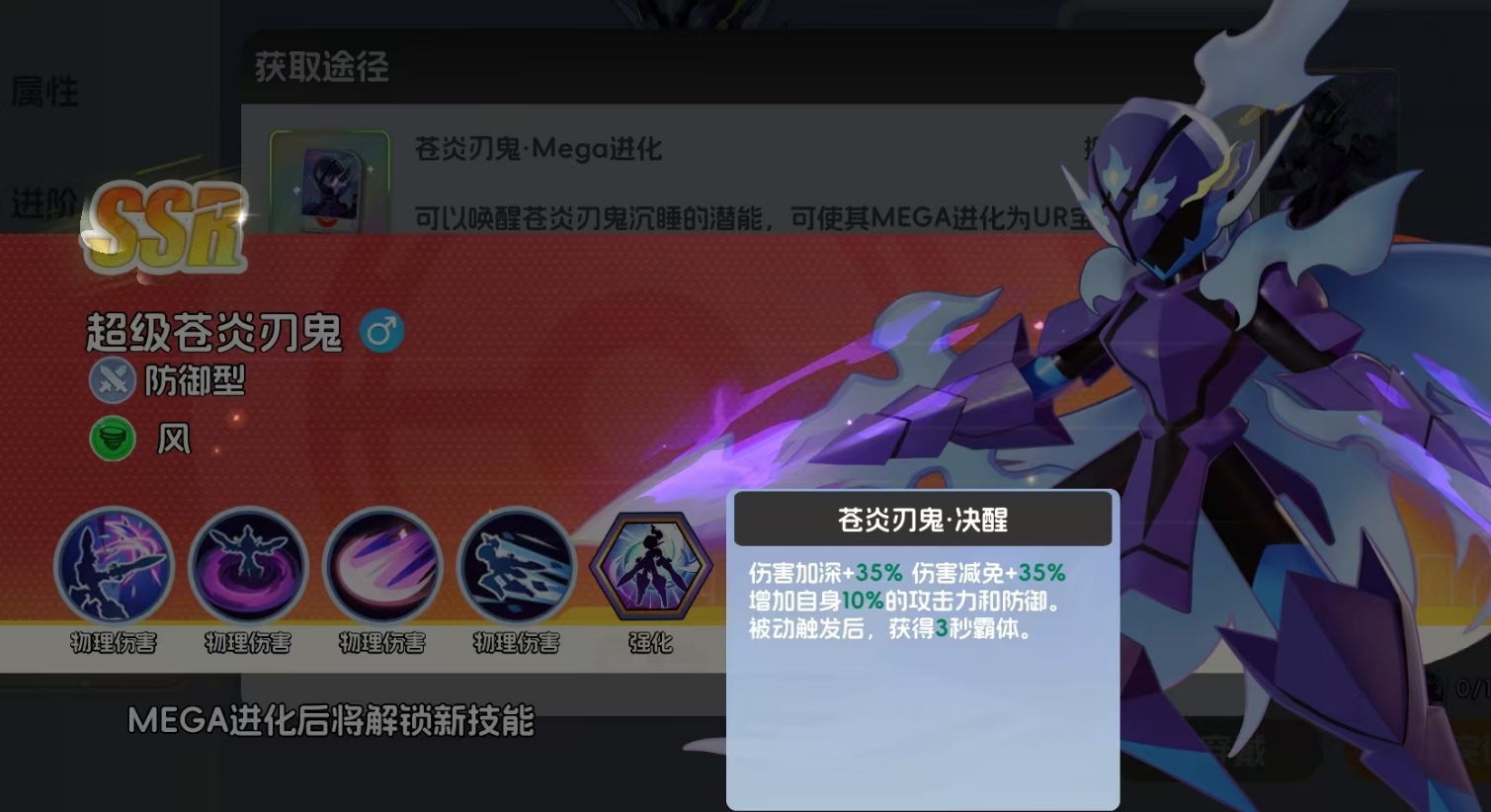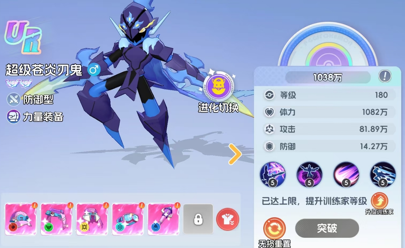 完成MEGA进化后,超级苍炎刃鬼的品级也将提升至UR级,同时它还会继承炭小侍原本的特性,依旧为风属性的防御型宝可梦,后续玩家若想继续为它升阶,依旧需消耗风属性的升阶素材。而在装备方面也是一样,超级超炎刃鬼只能穿戴力量型的装备,并且还能继续享受到装备里的风阵营加成效果,配合上MEGA进化带来的超高属性提升,可令拥有更为夸张的战力。