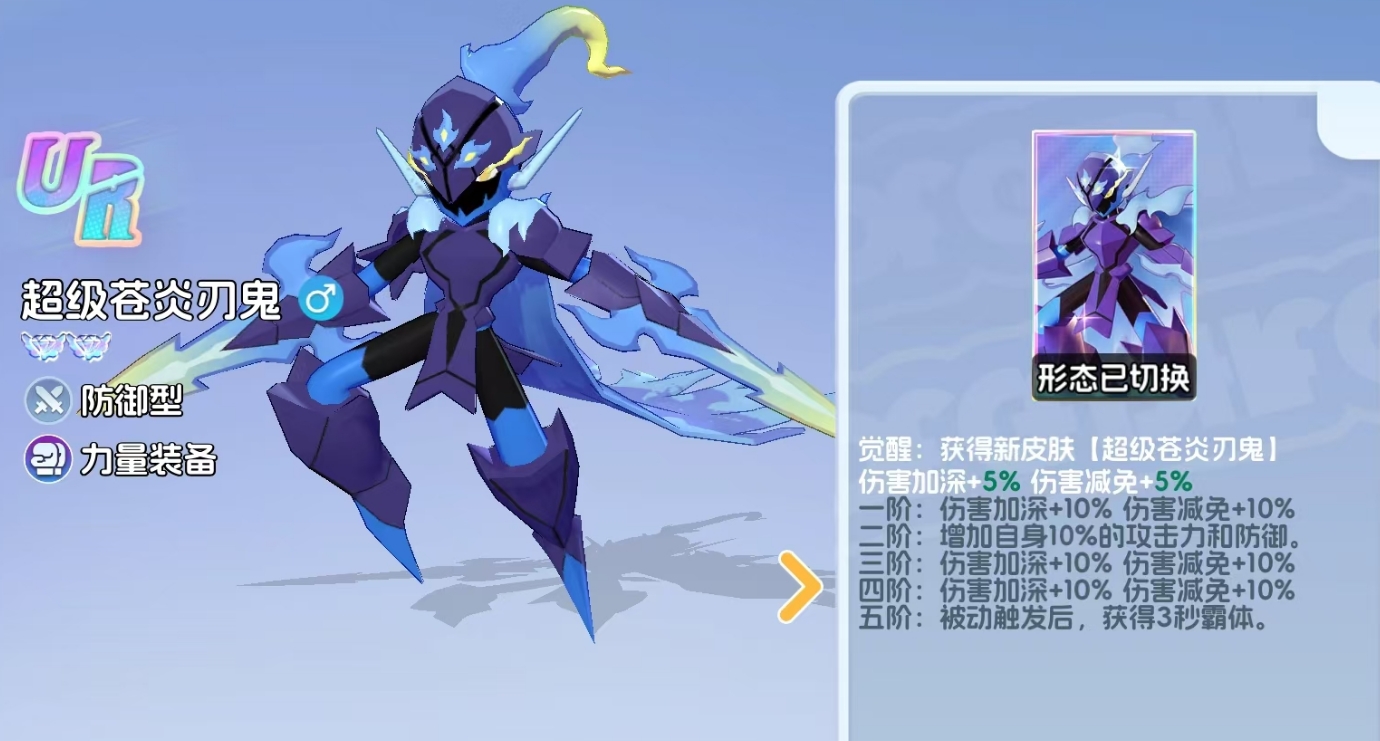 但在技能方面,完成了MEGA进化的超级苍炎刃鬼除了拥有炭小侍基础的四种技能外,还会因为进化而获得一个新技能,初始时会得到伤害加5%、伤害减免加5%的加成,且随着MEGA进化突破至上限,最高可令它享受到伤害加35%、伤害减免加35%以及增加自身10%攻击和防御的效果,并且在它发动自己的被动时,除了能像原先那样获得伤害减免外,还能额外触发霸体效果,确保超级苍炎刃鬼在战斗中不会被敌人控住,以便能更顺利地利用被动来恢复自身的血量,进一步强化了它的承伤能力,使得它在实战中会有更为强势的表现。