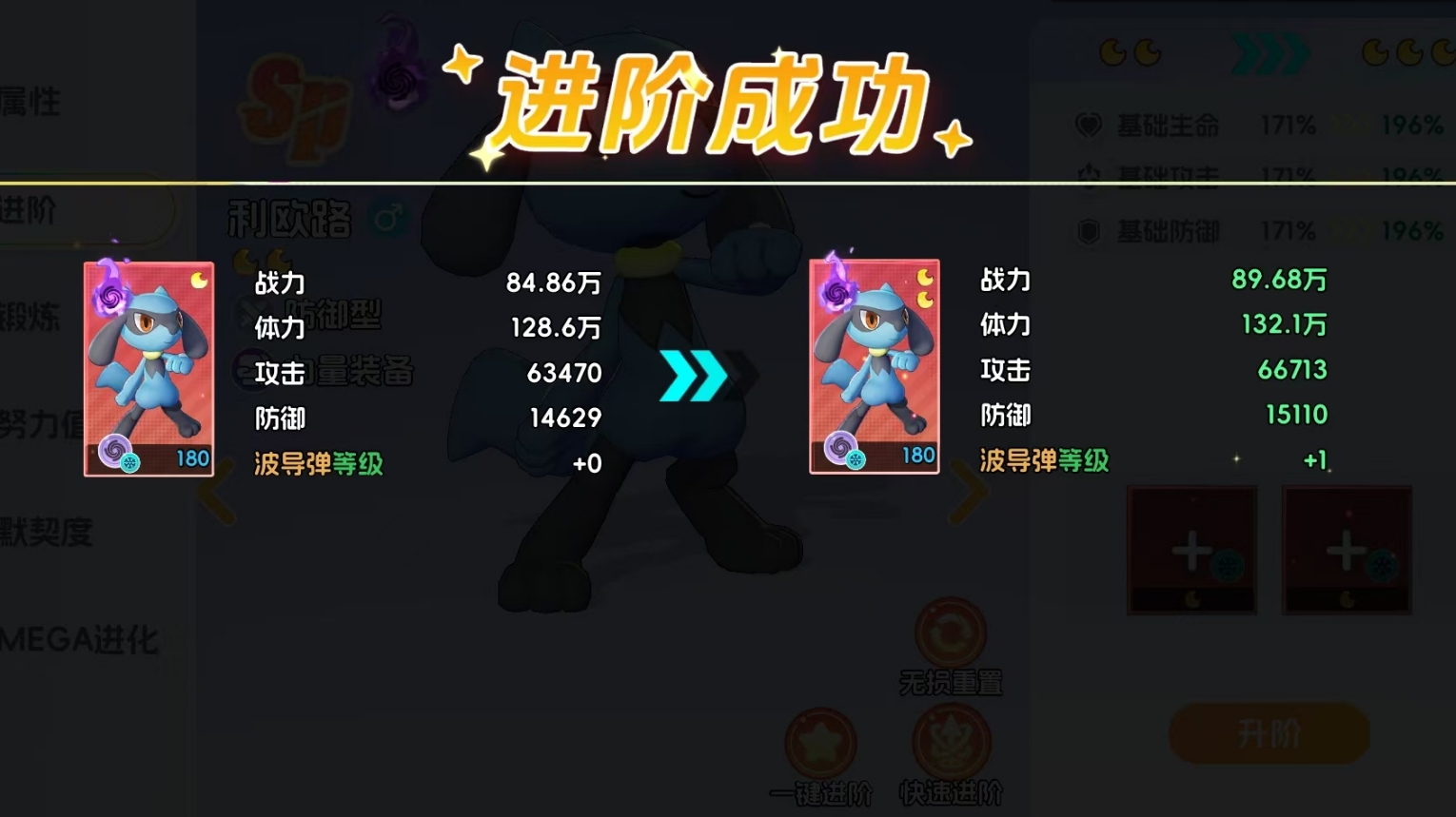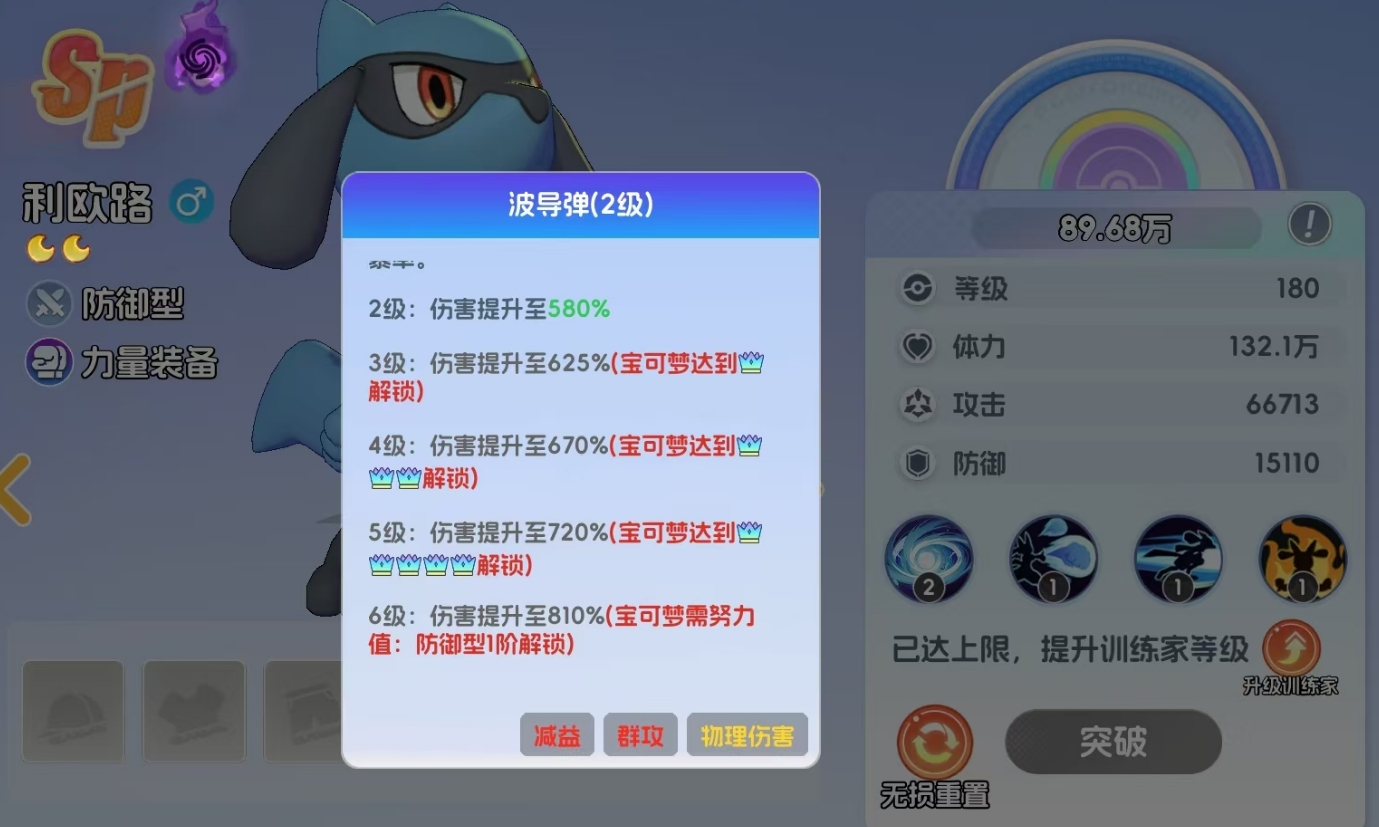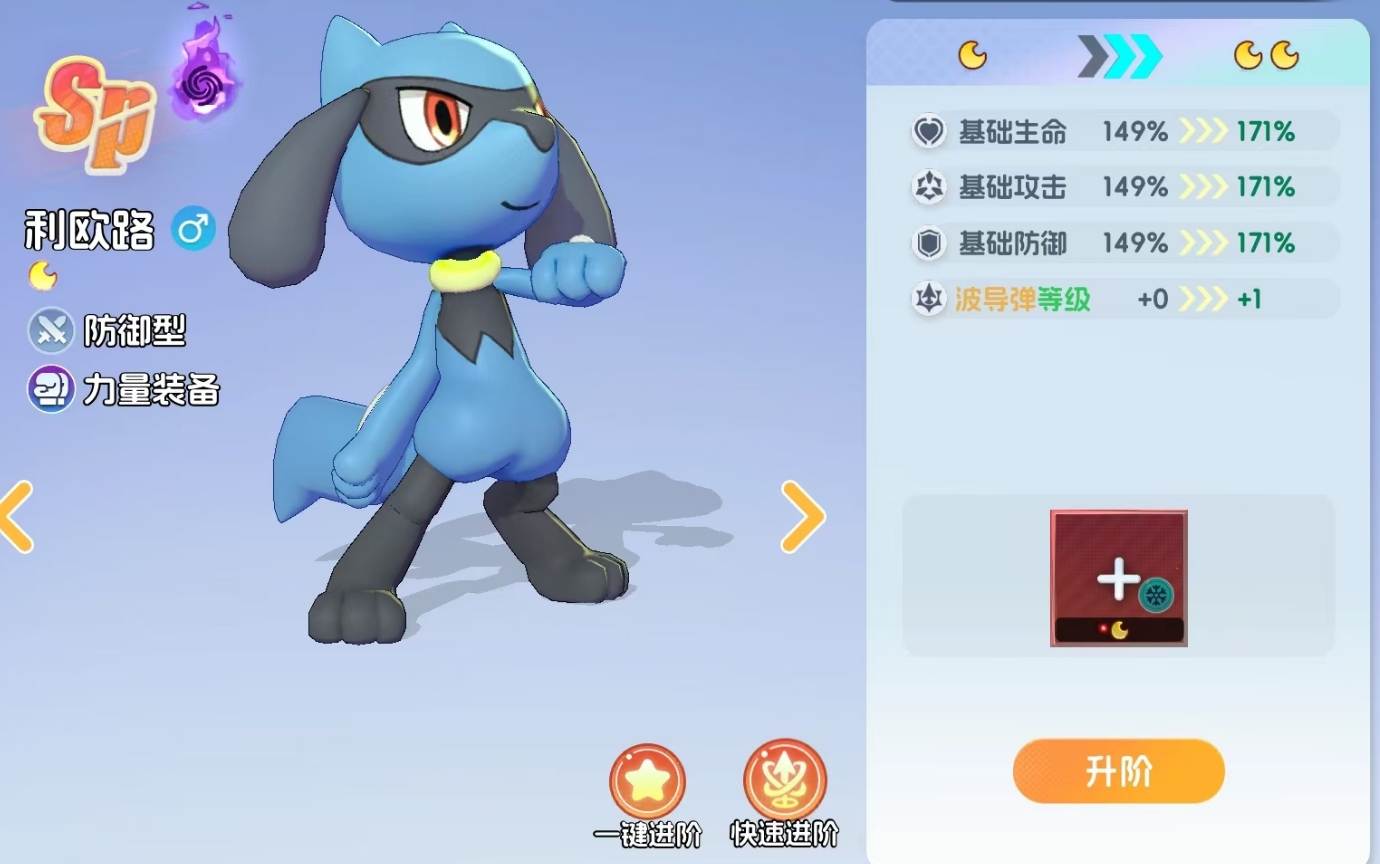 要注意的是,初始品阶为SR的宝可梦最高只能升至月亮1阶,只有SSR宝可梦和SP宝可梦可升至满阶,因此玩家在养成时最好重点培养后两种宝可梦,它们的养成上限更高。升阶后的宝可梦不光属性会得到的提升,还能在完成相应节点的进阶后,解锁自己的全新形态,技能的等级也会随着升阶而升级,所以升阶是提高宝可梦练度非常关键的养成环节。