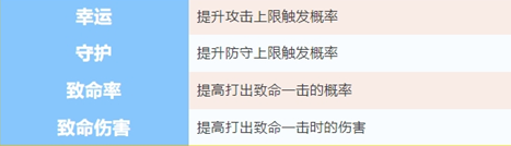 勇者使用附魔石有一定概率会提高装备的附魔属性,不同装备对应的附魔属性不一样,但总共分为幸运、守护、致命率、致命伤害四种,对应的属性说明如下:
