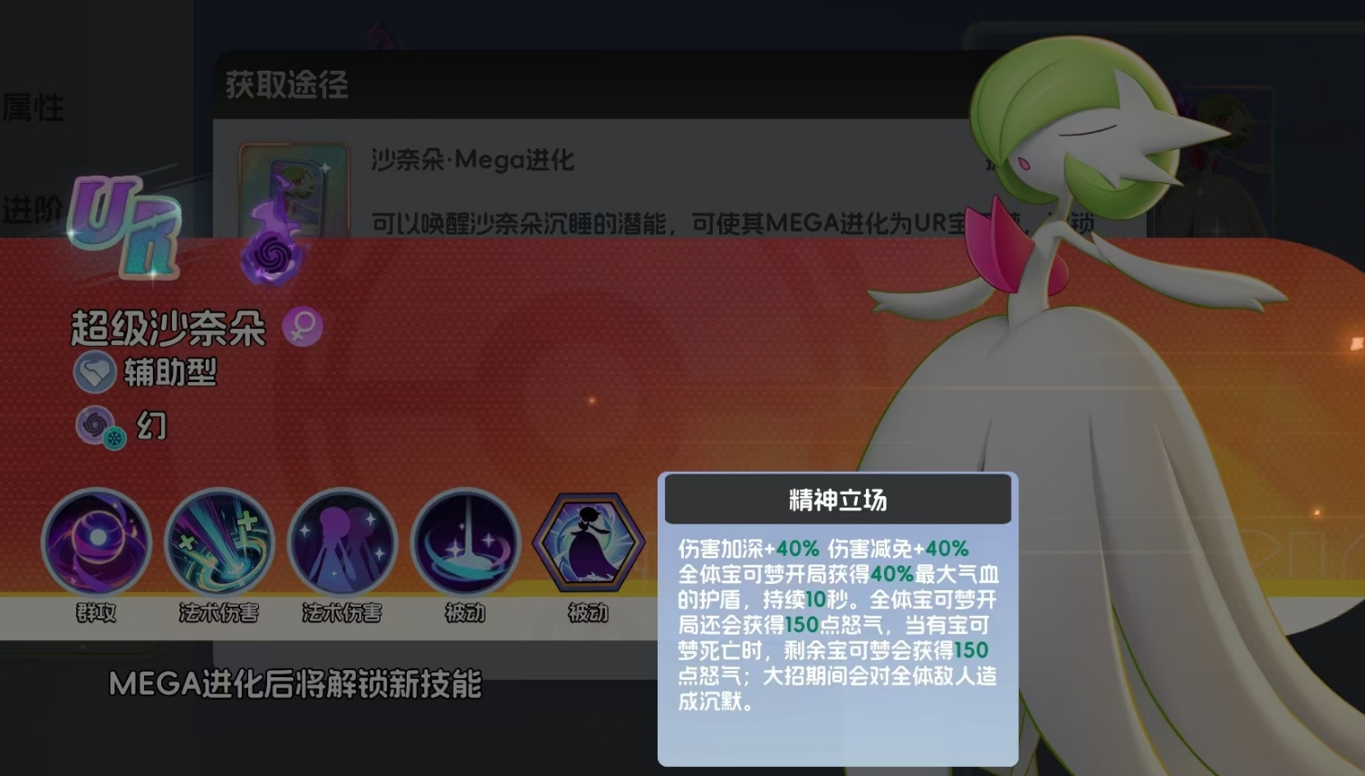 超级沙奈朵是拉鲁拉丝的MEGA进化形态,它继承了拉鲁拉丝的一切能力,可以制造出能沉默敌人的黑洞进行控场,并且处于黑洞区域内的敌人还会受到移速、攻速双双下降90%的负面,同时还能为队友提供诸多的增益。当然,超级沙奈朵也具备着治疗己方宝可梦的能力,当它释放魔法闪耀时,便能为队友回复生命。若超级沙奈朵不慎受到攻击,它也可像拉鲁拉丝那样,释放幻象嘲讽住敌人,并用瞬移与敌方拉开距离。此外,开局就能获得100点怒气和为全体提高12%攻击力的被动,超级沙奈朵也一并进行了继承。