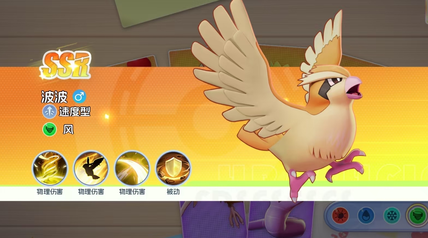 波波在宠物集结里是初始品级为SSR的宝可梦,它的定位为速度型,会在战斗中对敌人造成物理伤害。在1级时就能解锁的大招除了能让波波吹起风暴,令风暴路径上的敌人受到高额的伤害外,还能将它们全部击飞,并施加无法使用技能的封印效果,是一个兼具伤害与控制的技能。当波波达到11级时,它还能解锁自己的第二个技能,令自己能在开局时就飞到敌方后排进行突袭,配合上41级能解锁的空气斩,能让波波爆发极高的连招,快速削减敌方后排的血量。若敌方后排放的是以远程攻击为主的敌人,波波还能享受到被动的加攻效果,进一步提升自己对后排敌人造成的伤害。