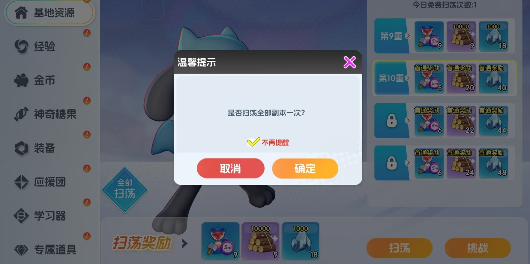 所有的关卡在成功完成一次挑战后即可进行扫荡,且扫荡只会扫荡玩家已经挑战过的最高难度关卡,不会去扫荡低难度关卡,玩家们也无需去选择关卡进行扫荡,游戏会自动帮玩家们选定。每一类资源的关卡每天都可扫荡两次,次数用尽后会在零点重置,很建议玩家在下线前先去特别课程里再进行一次关卡挑战,看自己能否打过更高难度的关卡,然后再进行扫荡,这样就不会亏资源。此外,宠物集结还提供了一个全部扫荡的功能,它能一次性帮助玩家们扫荡完所有的资源关卡,不需要玩家一个个去进行扫荡,玩家可多多利用这个方便的功能。