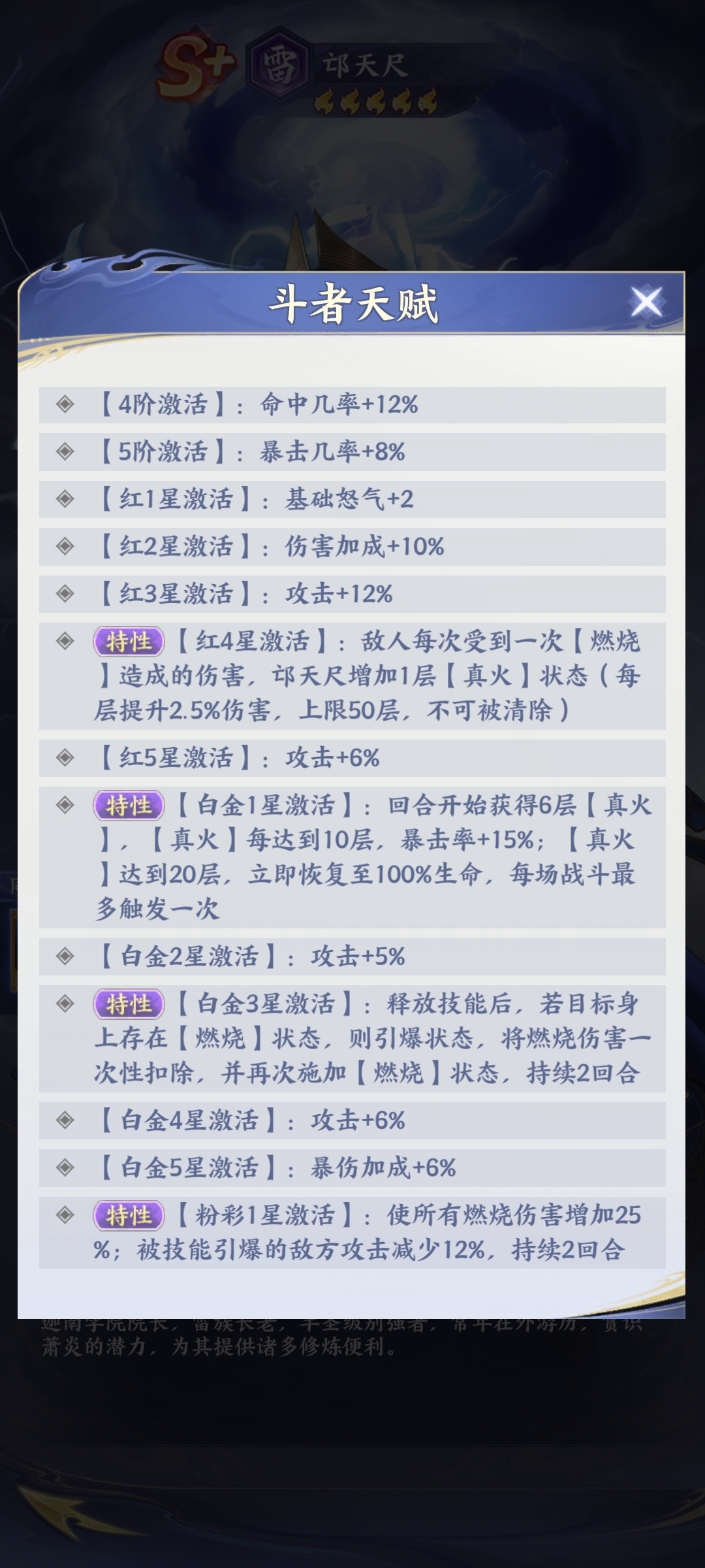其实在整体战斗的过程当中,如果敌人有一名角色直接处于燃烧的状态,那么在这时候再次释放的概率将会有所提高,也就是说,在战场上面如果有大量的燃烧敌人的时候,邱天尺就能够无限释放技能,这时候就能够将雷电跟火焰有效的发挥到极致。