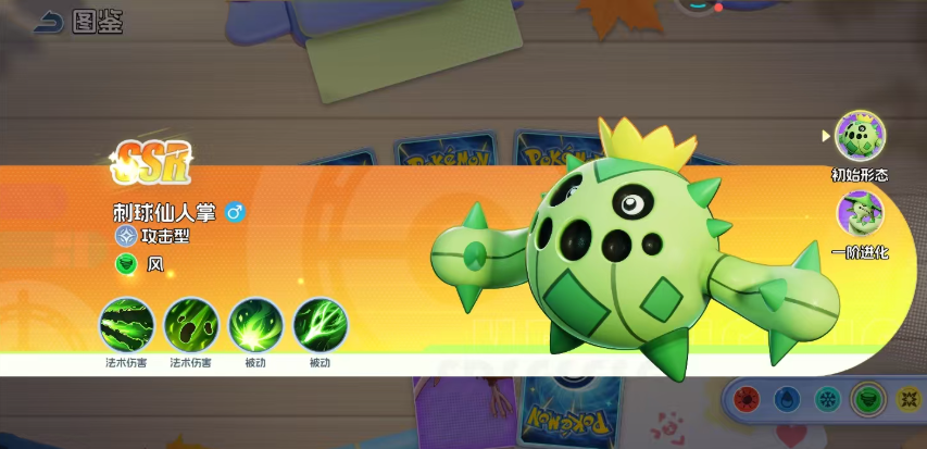 初始的形态就是刺球仙人掌,圆滚滚的身躯上面全部都是尖锐的倒刺,作为一个风属性的攻击型宝可梦,战斗的风格主要是以隐忍还有反击作为核心。被动技能在受到攻击时就可以反弹一部分的伤害,并且还会施加一个微量中毒的效果,可以给后续的进化埋下一个伏笔。此时的刺球仙人掌还是需要大家去耐心的培育。