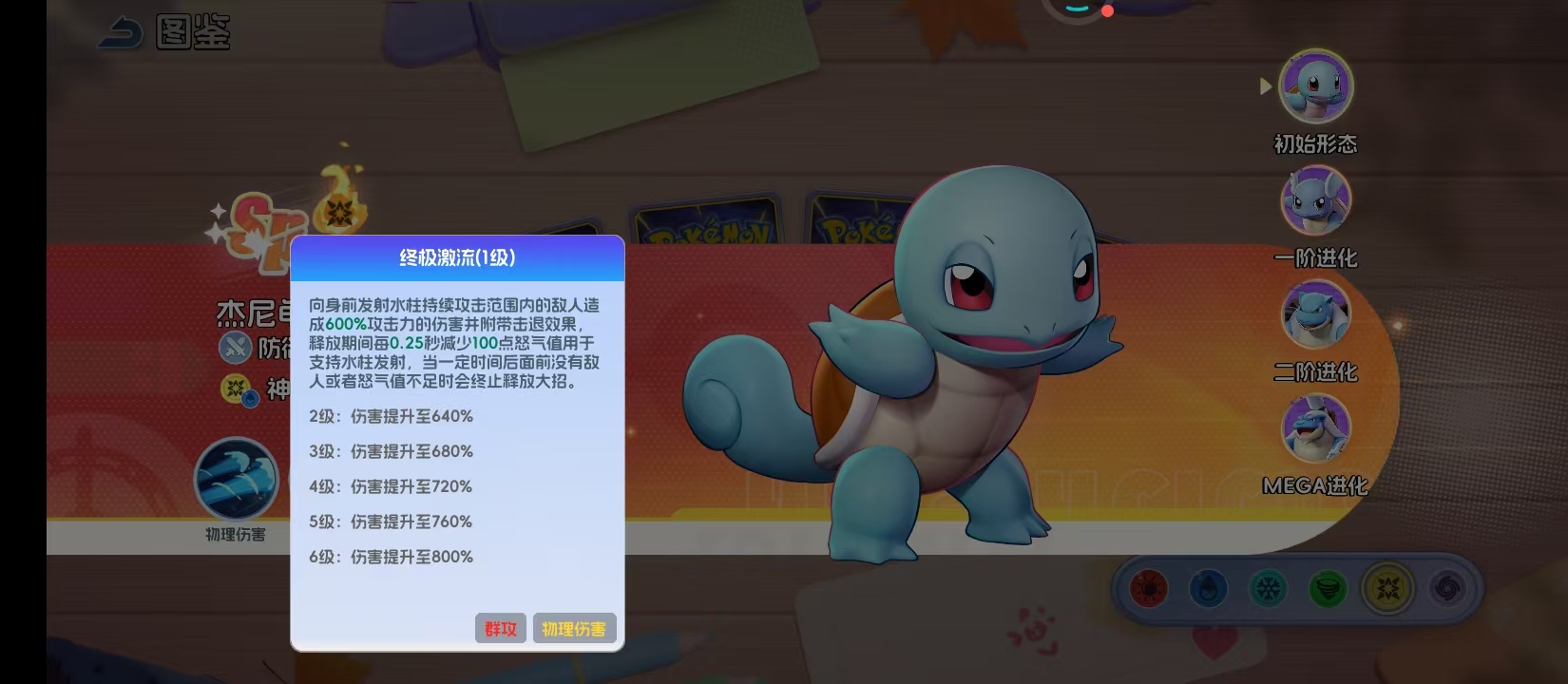 加农水炮是11级时解锁的,这就是杰尼龟的群体输出核心,每一枚都有290%的攻击力伤害。在6级时伤害就可以提升到420%。8级时更能发射9枚水泡,可以覆盖所有的敌人。不同于大招的持续压制,加农水炮是瞬间爆发的清场能力,在面对敌方残阵时,就可以扭转战局。作为物理伤害技能,可以和杰尼龟的攻击属性完美的符合在一起,让它可以打出较高的输出。