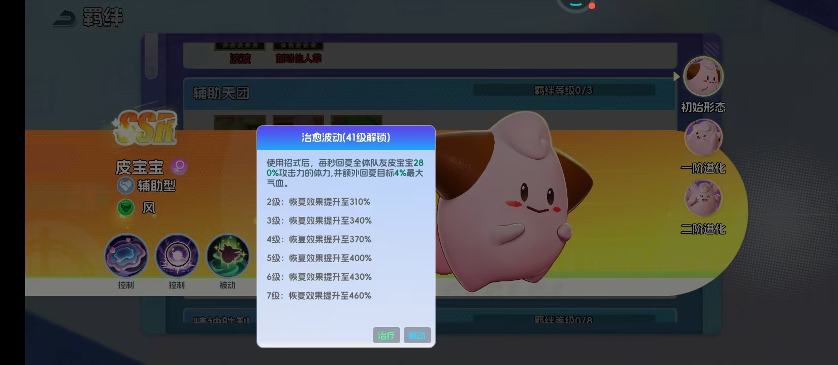 月亮之力是11级可以解锁的技能,可以针对敌方密集区域释放,造成范围内的伤害,并且会让敌人陷入到无法动弹的状态,会有持续两秒的时间。这一个技能就是魅惑之声的绝佳补充,让敌人在试图逃离时又会再一次被锁定,为队友创造出更加完美的输出空间。还有41级会解锁的被动技能治愈波动,可以让皮宝宝在释放招式之后,每秒都会为全体队友回复280%的攻击力体力,并且还会额外的回复目标大约4%的最大气血。