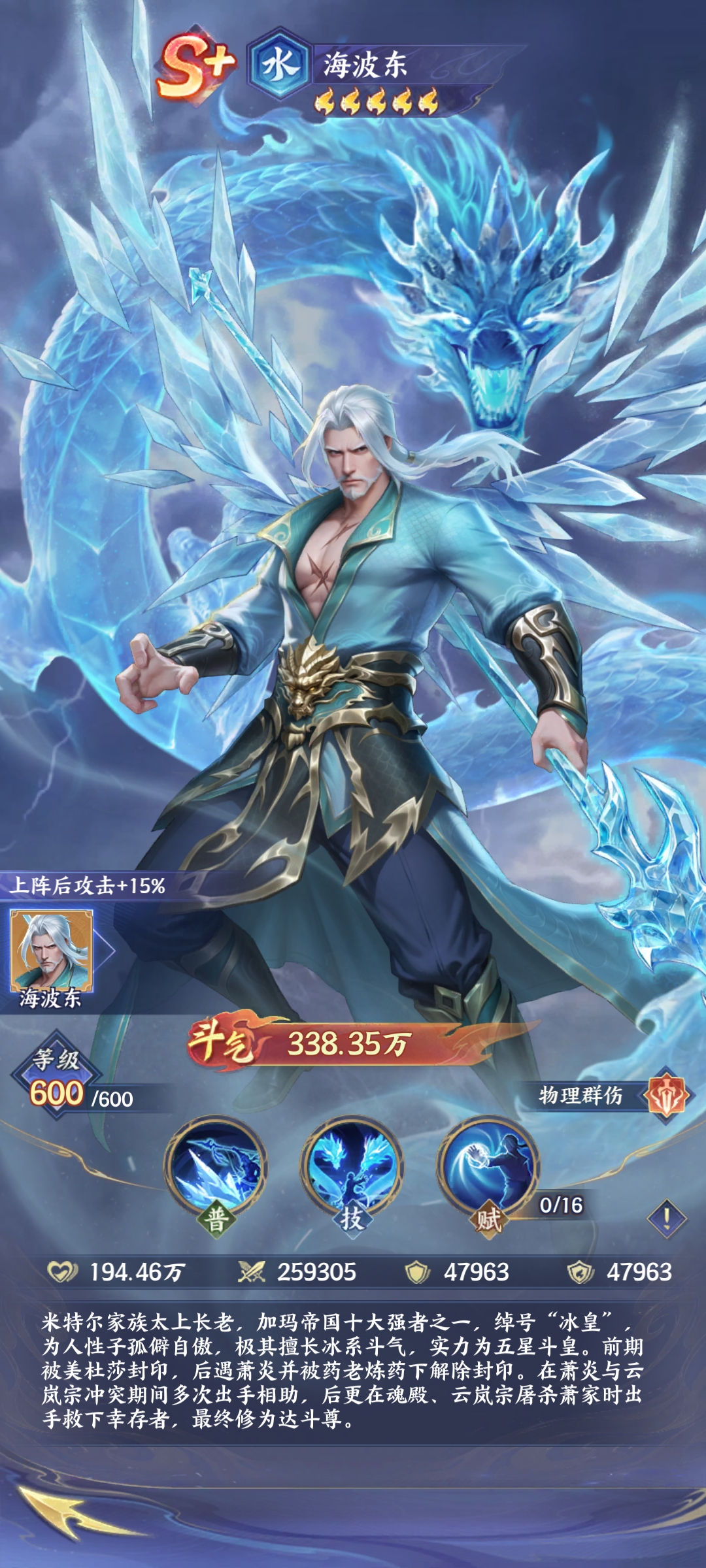 海波东在原著当中被称之为冰皇,其实他的实力比较强悍,作为S加级别的水属性,物理纯伤类型的斗者。对于玩家来说,他如果施展他的招牌技能也就是玄冰龙翔,一旦释放之后,将会对敌人的全体造成高额的伤害,并且这个技能攻击之后还会追加一次普通攻击伤害,简单来说,也就是在一回合以内就能够给敌人的全体造成了两次攻击伤害,在这样的情况下能够有效的达到清场的目的。其实更重要的是,他的这次普通攻击技能不会增加怒气值,但是能够让他更快的释放大招,这样的话就会形成持续性的压制,能够让全体的实力上升。
