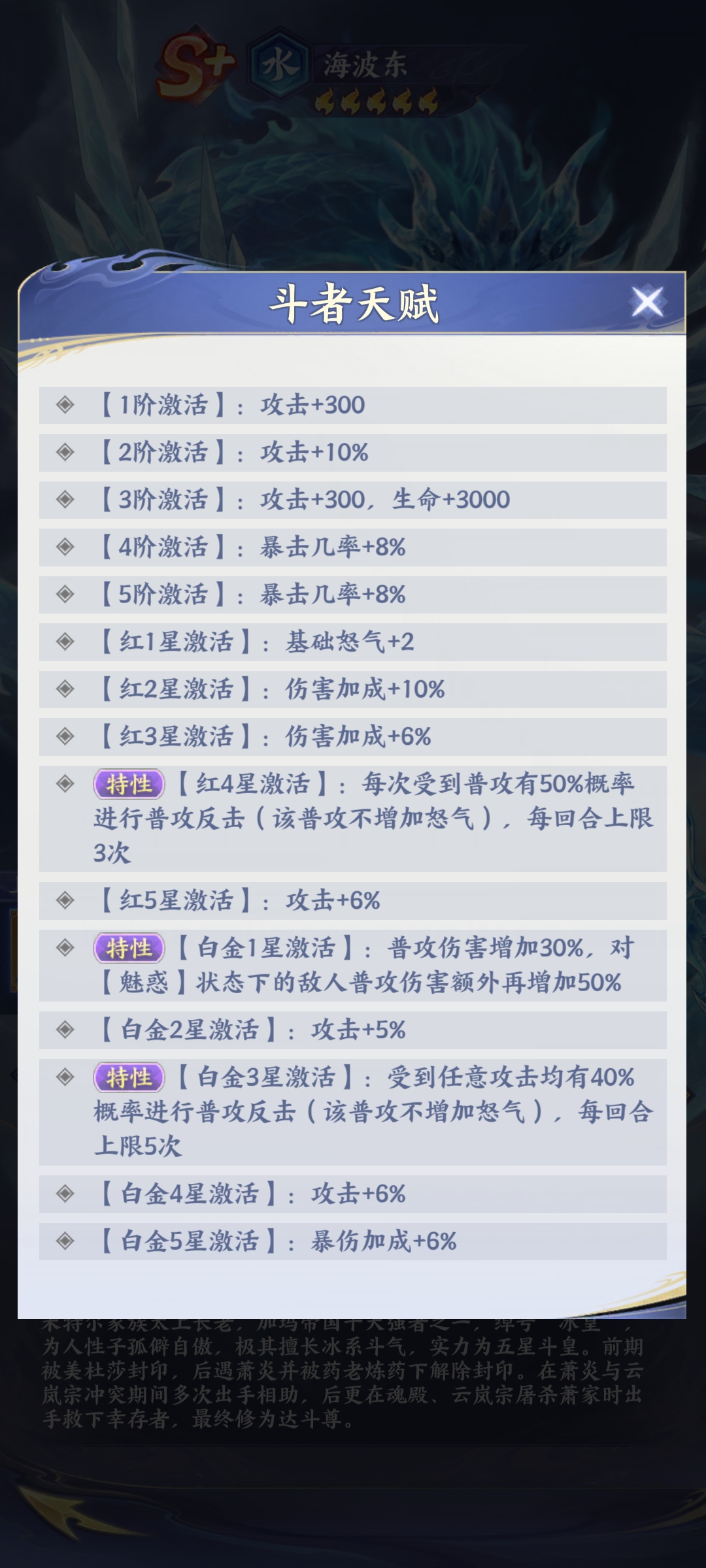 玩家如果关注海波东会发现他作为一个全能类型的角色,每次受到普通攻击的时候,他其实就有一定的概率能够进行普通攻击的反击,面对普通攻击流的时候,他往往能够打出意想不到的效果,这个其实就是红四星的特征,针对于白金一星的特征,往往又发生了改变,因为它的普通攻击伤害将会增加,如果处于魅惑的状态下的敌人,此时敌人已经被控制住,那么这时候的他将会施展普通攻击伤害,此时就会有所增加,所以说,玩家此时此刻将海波东进行特定阵容的搭配,那么他的实力是非常强悍的。