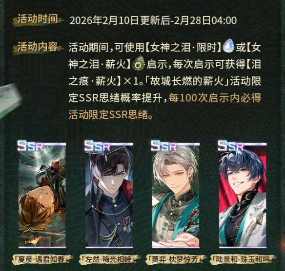 未定事件簿新春活动有哪些?本次《未定事件簿》新春版本的核心玩法围绕“故城长燃的薪火”大型主题活动展开,整体结构划分为双主线:角色卡池更新与沉浸式剧情活动。卡池系统采用全新独立四人分池机制,分别对应夏彦、左然、陆景和莫弈四位男主角。