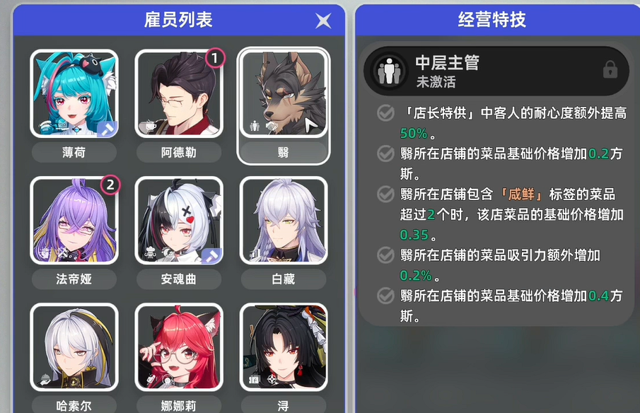 买完店之后就要安排人手。游戏里每个角色都有自己的技能,有的会做饮料,有的擅长烤东西。安排员工的时候要看他们会什么,会调酒的就让他去吧台,会做蛋糕的就安排去甜品区。这样效率才高,店里生意才能好起来。如果安排错了,那就等于浪费人力,赚的钱也会少很多。